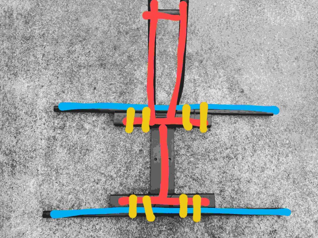 (画像の赤が自転車スタンド、青がパイプ、黄色が結束バンドです)